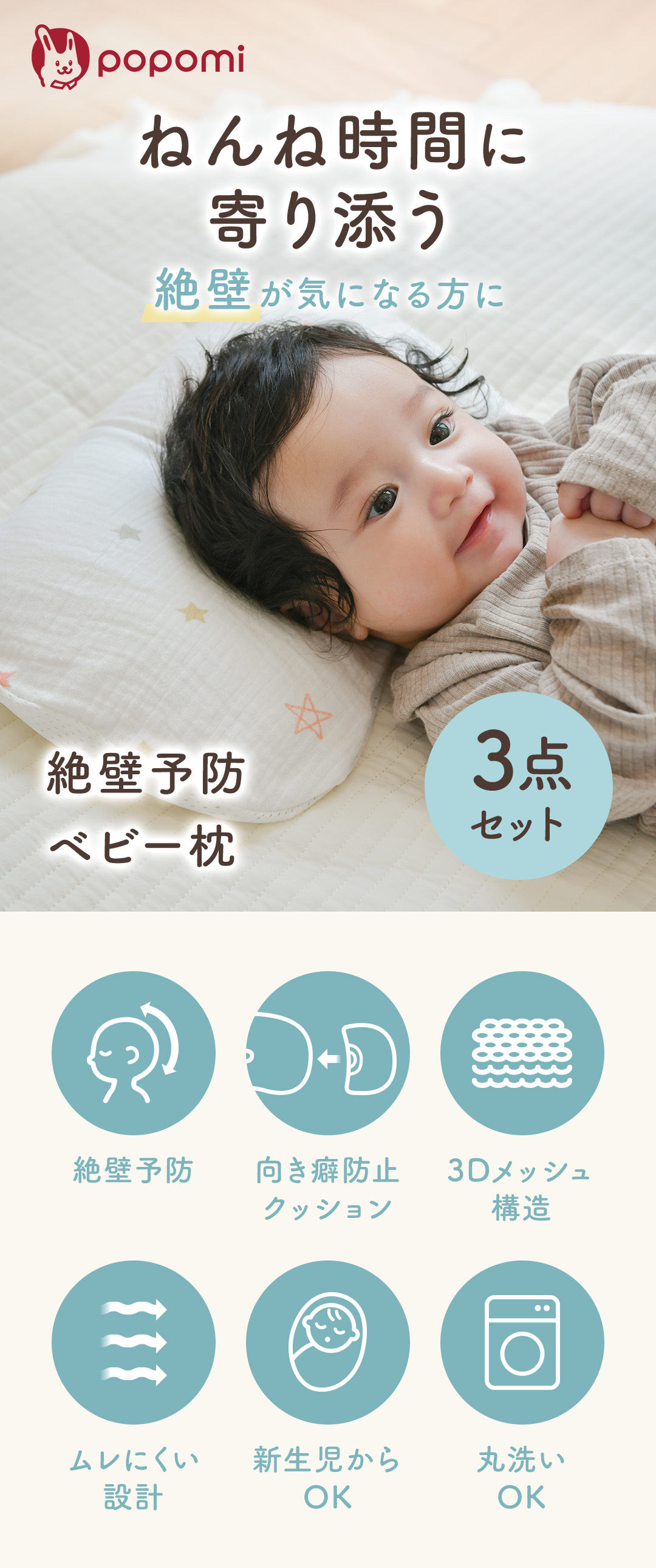 ・新生児から使える絶壁予防設計で、赤ちゃんの頭の形をやさしくサポート
