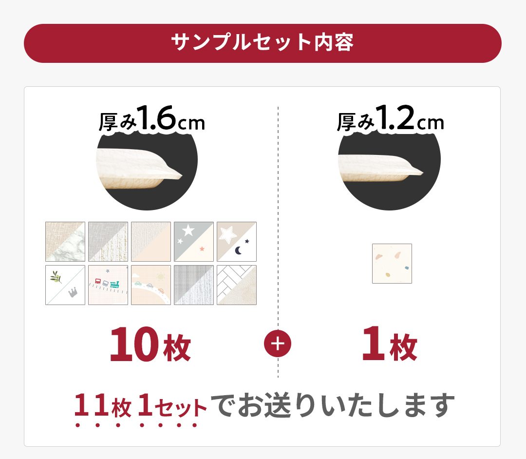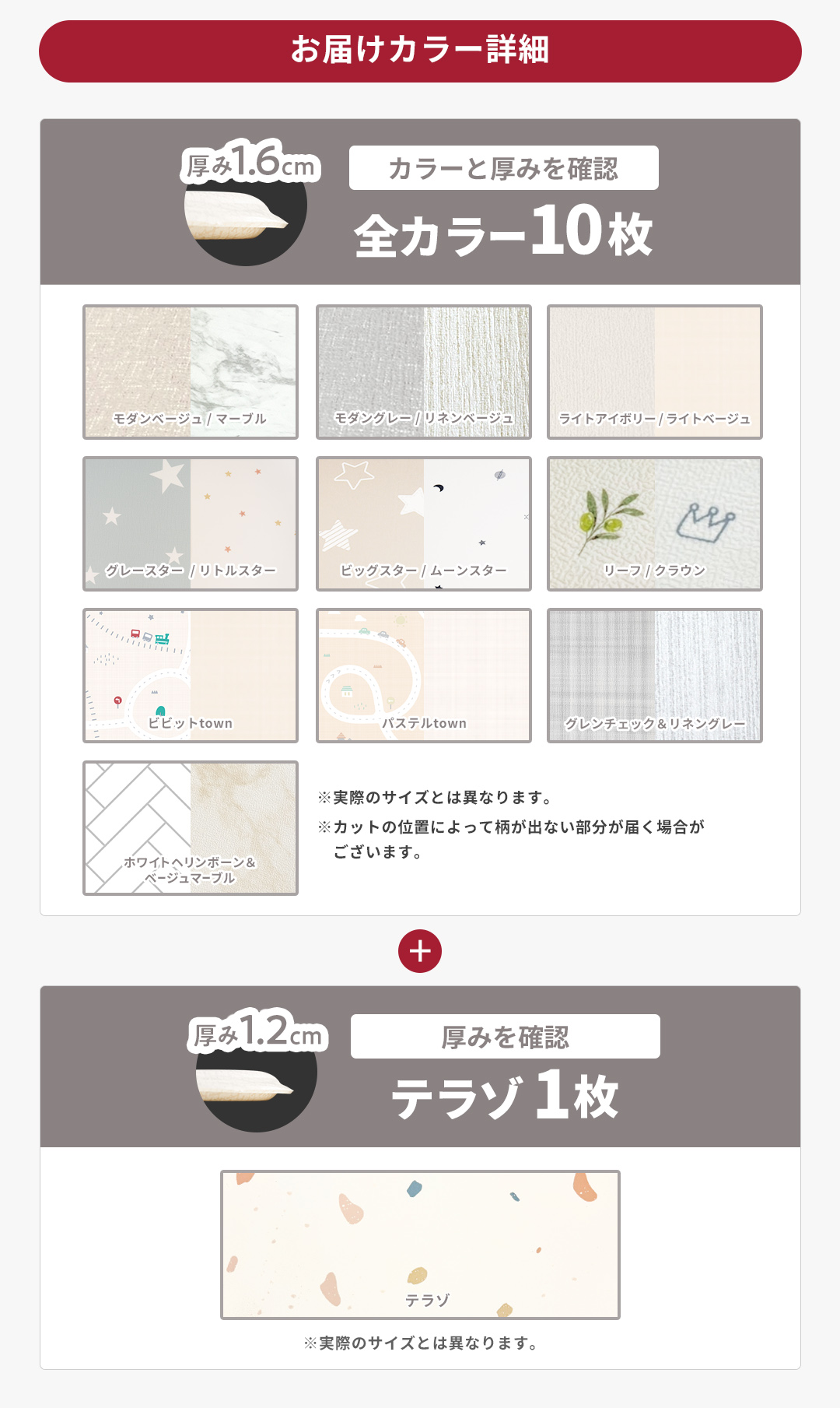 ・抗菌もちもちプレイマット厚み1.6cm:全カラー10枚、厚み1.2cm:テラゾ1枚を送付いたします。
