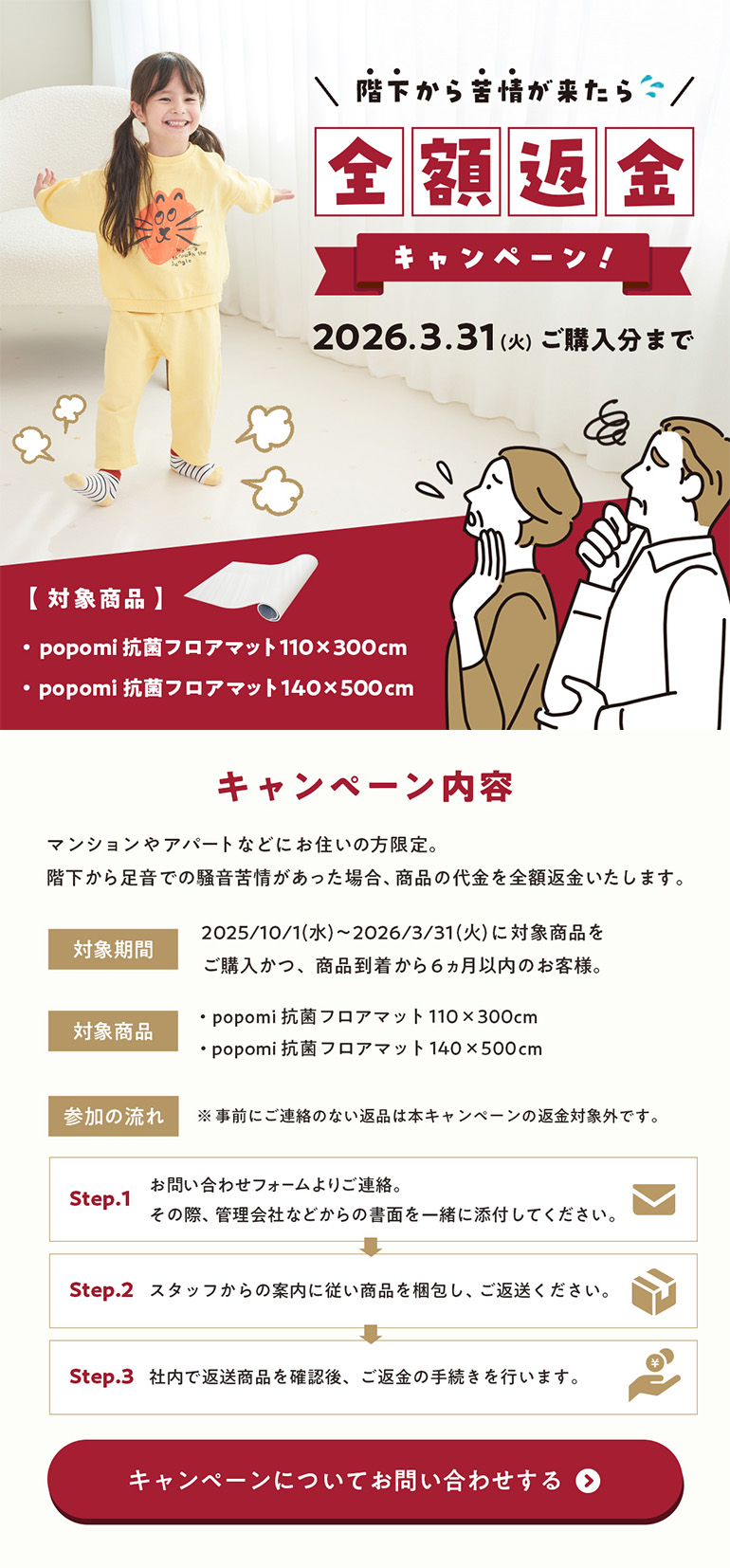 ・床暖房を使用する際、マットの表面まで床暖房の熱は伝わりません。また長時間の使用は避け、使用後は陰干しするなど手入れを行って下さい。また、熱によるマットの歪みや縮み、素材が丸まる恐れがございますが返品・交換は対象外となります。